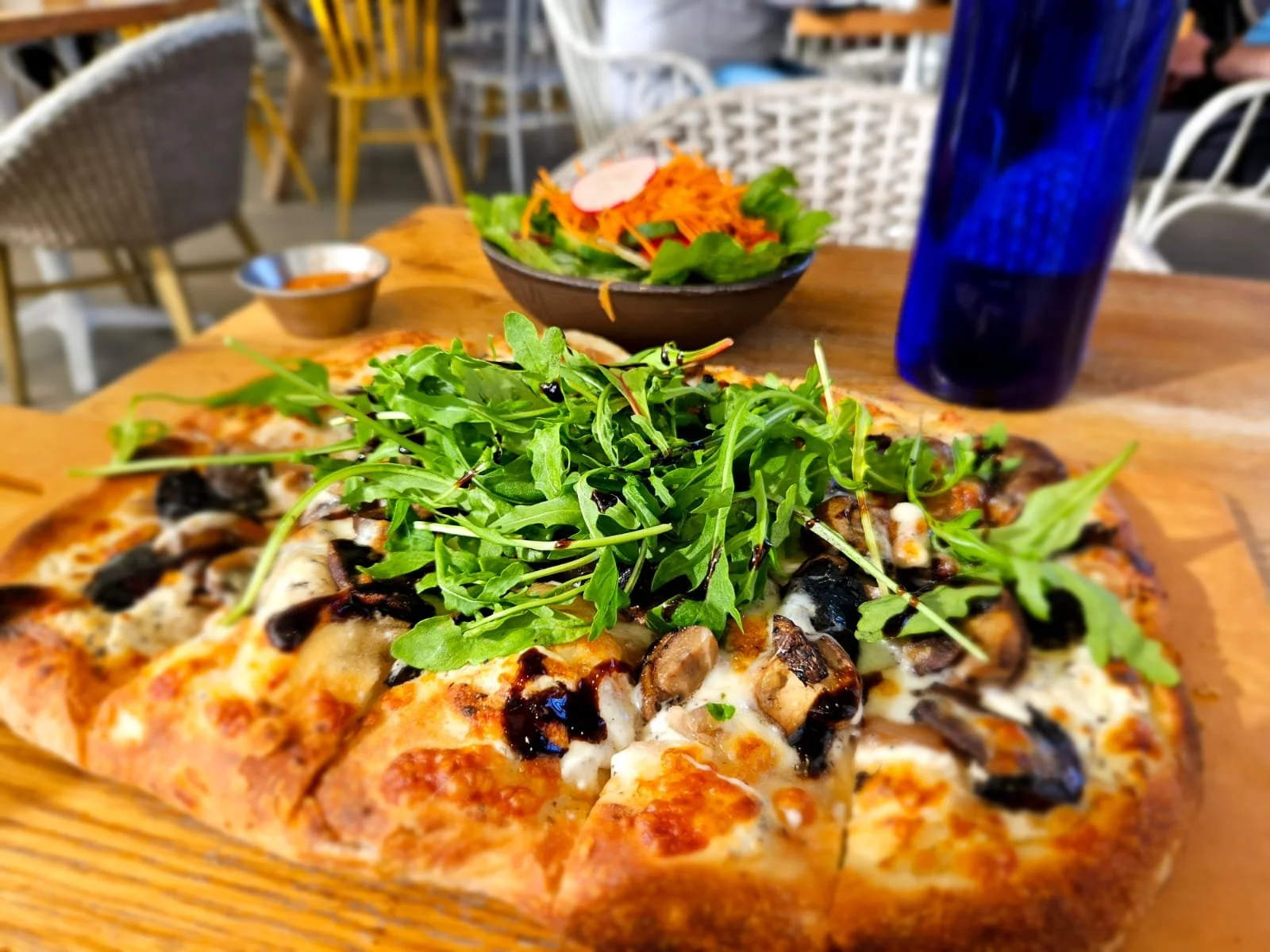 My order: Mushroom focaccia (NIS 74), which comes with a salad and hot sauce on the side; small cappuccino (NIS 13).