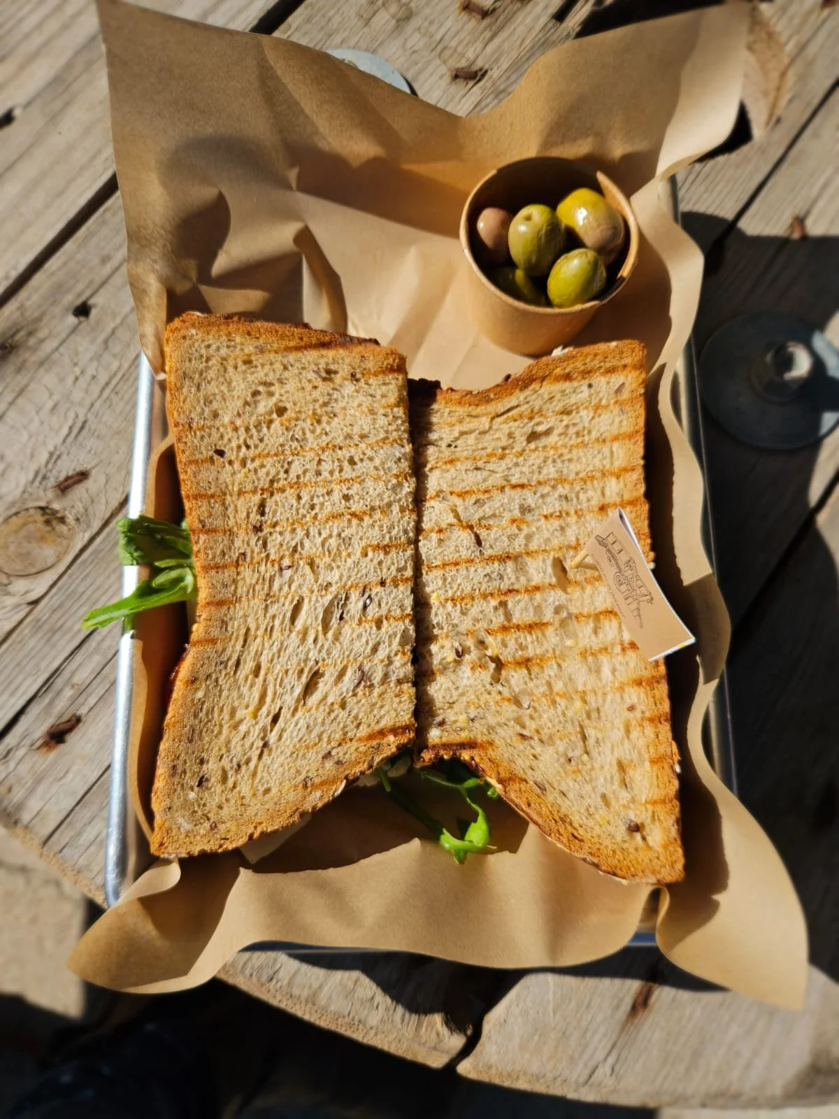 Environment: This coffee cart is parked at the edge of a moshav, right up against the fields. I had the luck to visit on a sunny, winter day, so the fields were glowing with a deep, healthy green. The coffee cart itself is accessible by a few wooden steps, and marked by notable signage in one corner. Generally, the coffee cart is heavily branded, from the signage on the cart to the toothpick in the sandwich to the parking area to the employees’ sweatshirts. Tables are spread all around the area, mostly on a concrete floor that served as the base of an old agricultural shed of some sort. Some of the tables are low, some are repurposed spools and old John Deere barrels, and there’s also a long wooden bar with high stools. A few picnic tables sit on the grass close to the refurbished cotton harvester for which the coffee cart got its name. Wooden planters full of flowers edged the area.