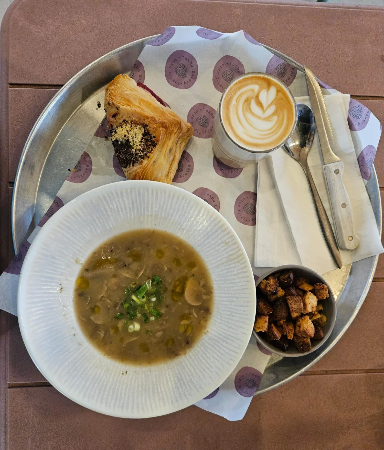 My Order: Soup of the Day (which was mushroom soup) (NIS 28); small cappuccino (NIS 14); beet and cream cheese bourekas (NIS 13); vanilla fruit tart (NIS 35).